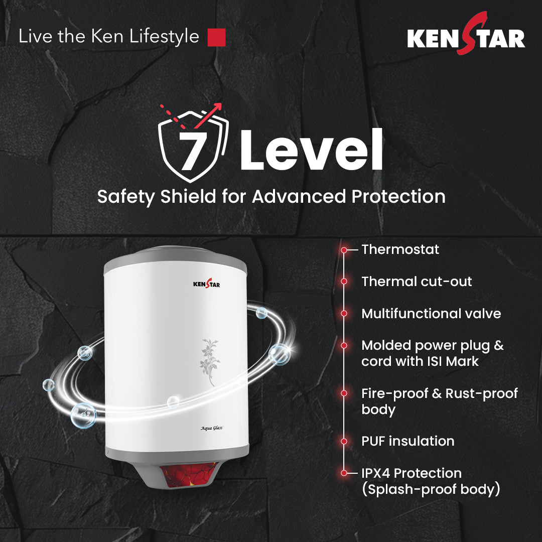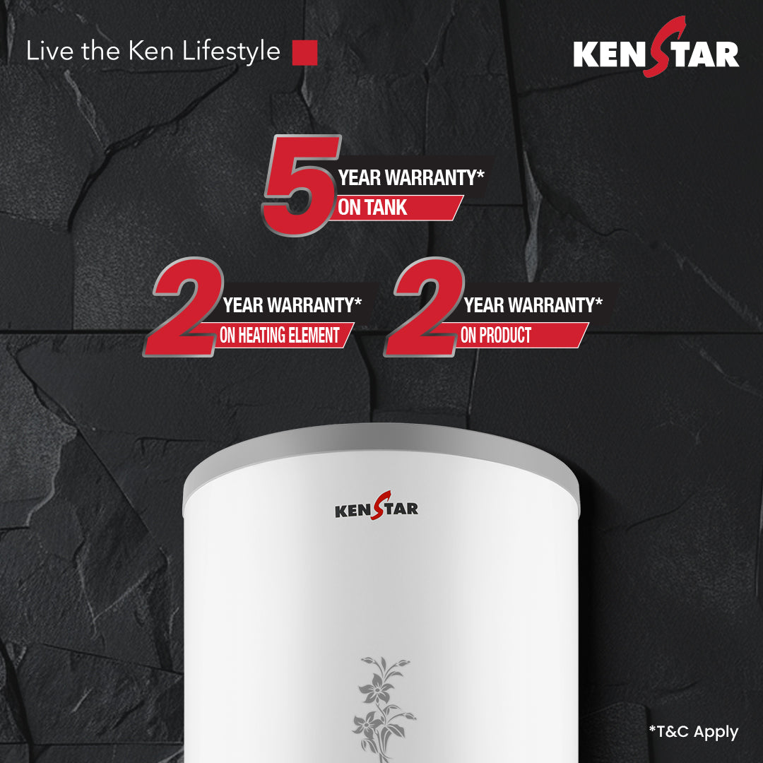 This water heater features a large 10L tank for a comfortable bathing experience and is powered by SwirlHeat Technology, delivering 20% more hot water output. It ensures advanced safety with a 7-Level Safety Shield and performs efficiently in hard water and high-pressure conditions, with 8 bar pressure compatibility ideal for high-rise buildings. The thick PUF insulation retains heat 10% longer, enhancing energy efficiency. With IPX4 protection, it resists water splashes for greater safety and durability. Built with a non-corrosive plastic body and a nickel-coated copper heating element, it ensures long-lasting performance. The LED temperature indicator adds a smart touch, letting you monitor water temperature with ease.
