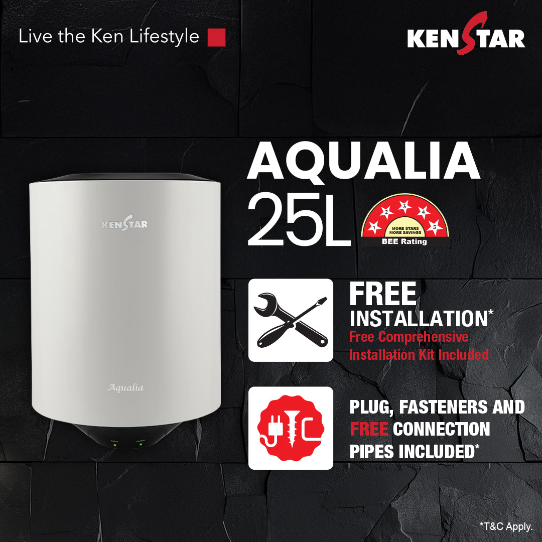 Aqualia water heater from Kenstar a best water heater brand in India is designed to offer both performance and durability with its large 25L tank, providing ample hot water for a comfortable bathing experience. It features SwirlHeat Technology, which ensures 20% more hot water output for improved efficiency. The 7-Level Safety Shield offers comprehensive protection from overheating, pressure build-up, and electrical faults. Built to withstand hard water and high-pressure conditions, it is also compatible with up to 8 bar pressure, making it perfect for high-rise buildings. The thick PUF insulation helps retain heat for 10% longer, promoting energy savings. For added durability, it includes IPX4 protection to guard against water splashes and a non-corrosive plastic body that resists wear and tear. The nickel-coated copper heating element further enhances its longevity by resisting corrosion, while the LED temperature indicator adds convenience by allowing users to easily monitor the water temperature.