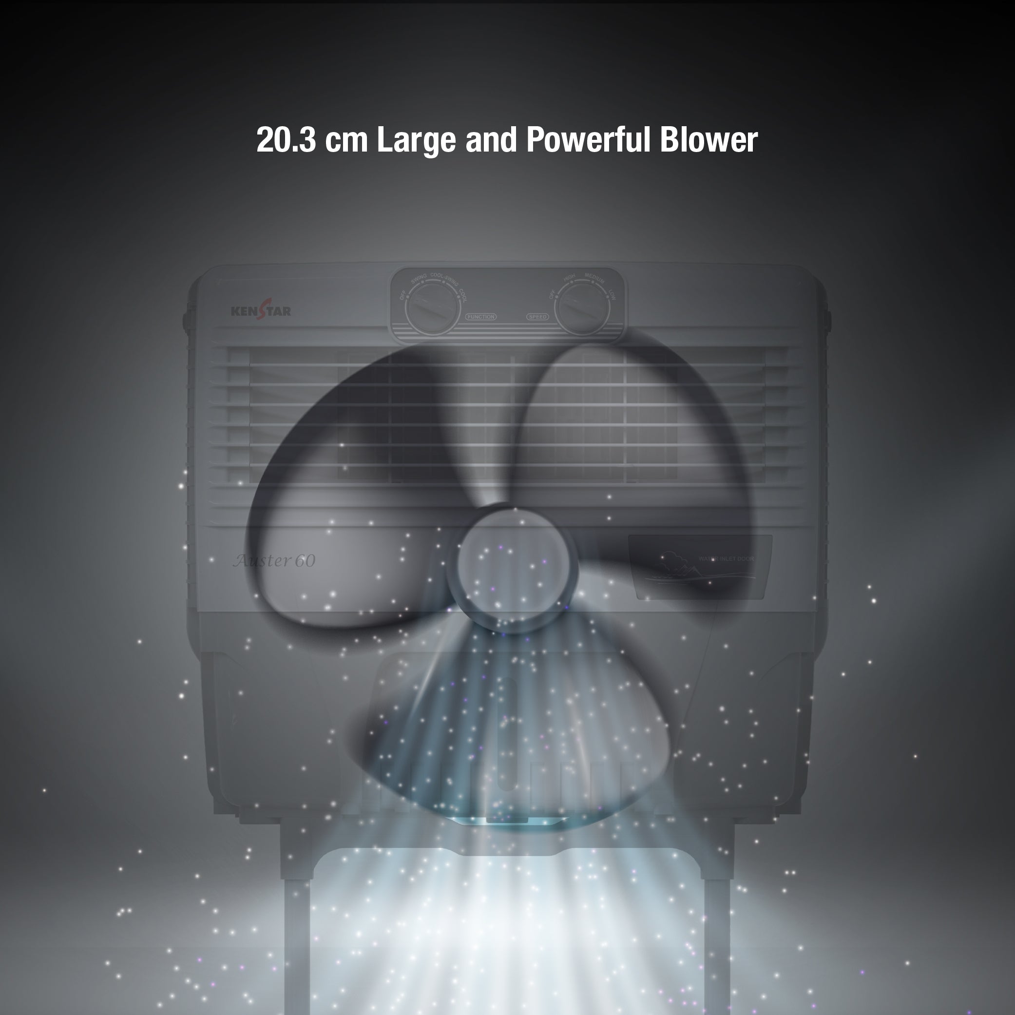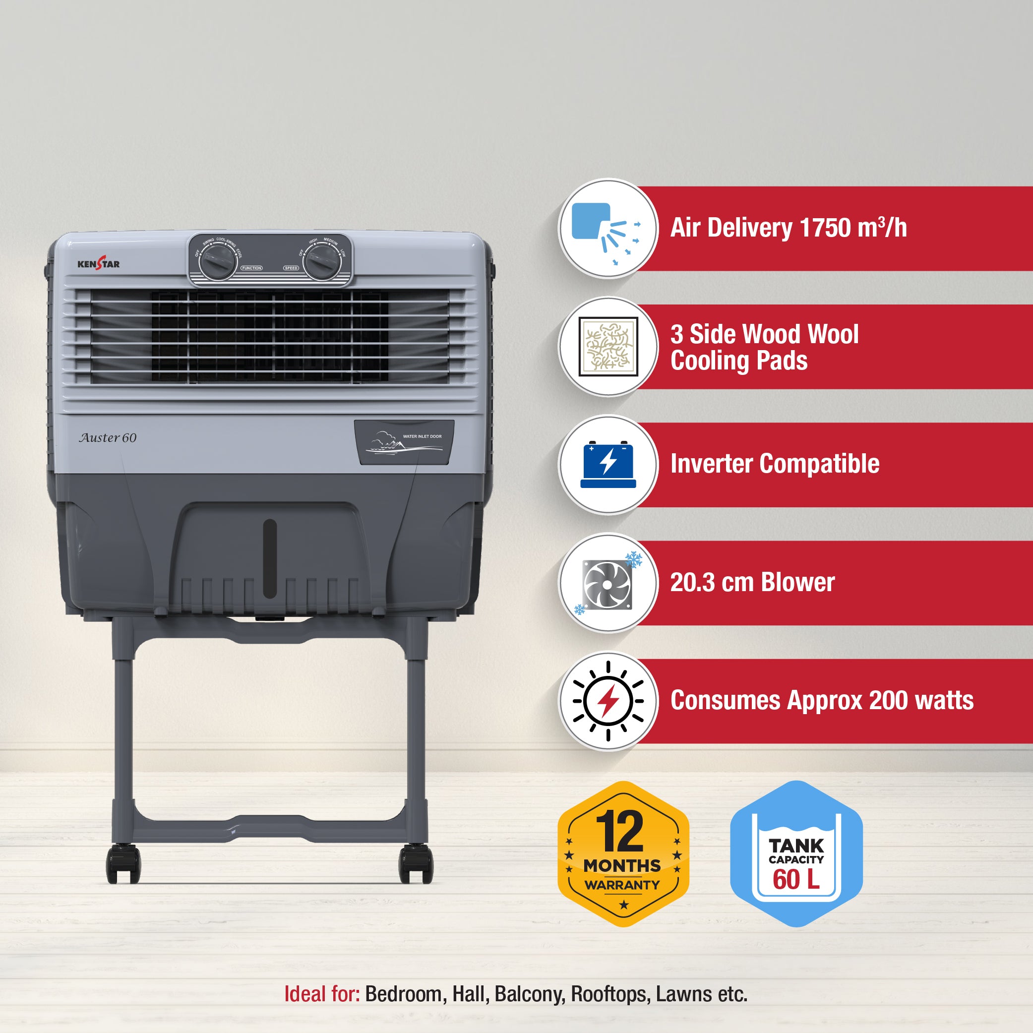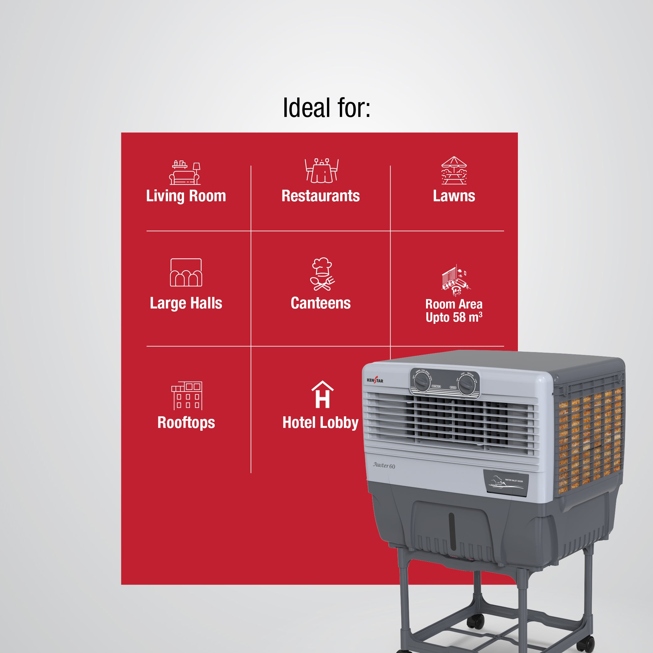 - The AUSTER 60 air cooler features a 60-litre water tank, ensuring extended cooling performance without frequent refills.
