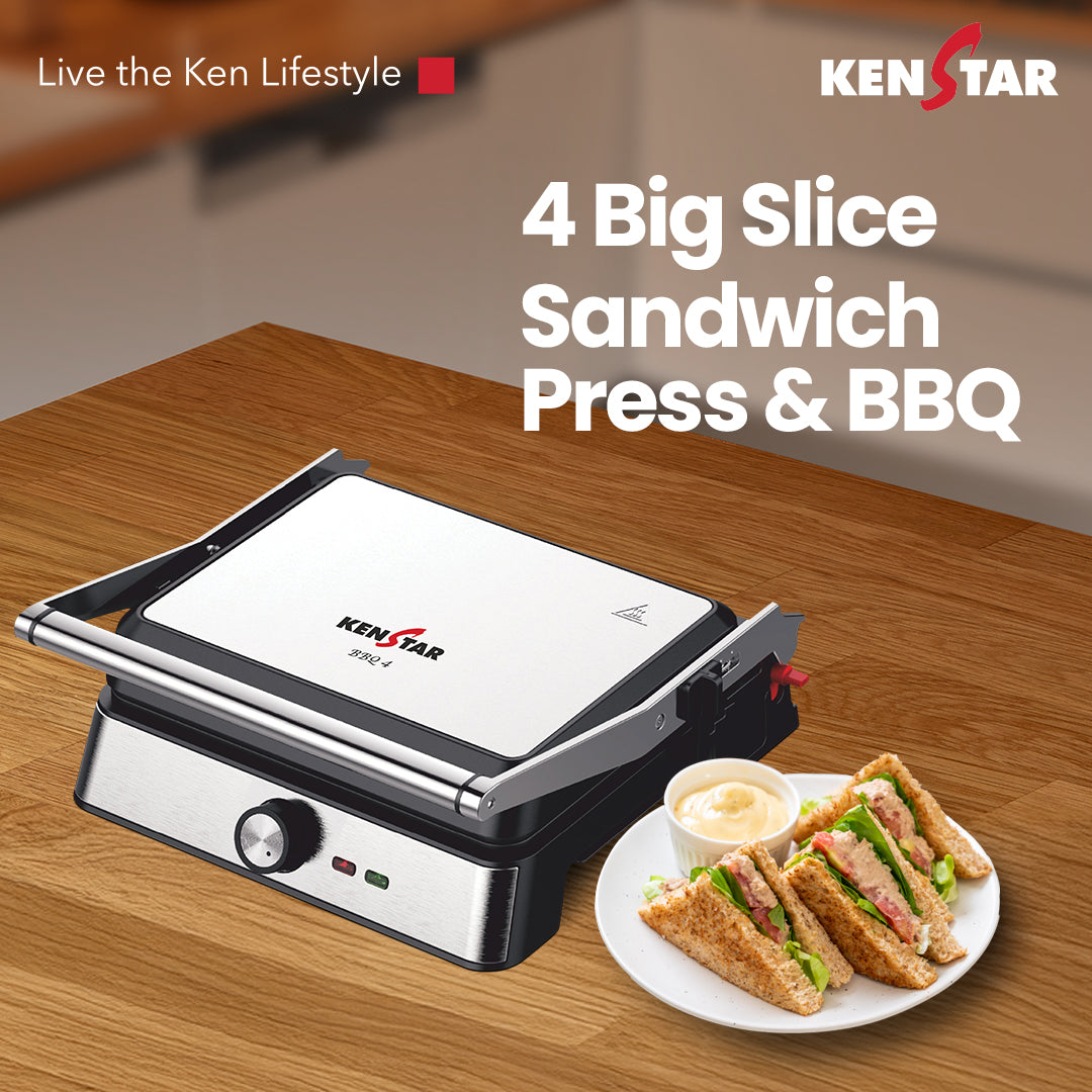 - Features four large slice sandwich press and barbeque plates designed for versatile cooking, from sandwiches to grilled meats and vegetables