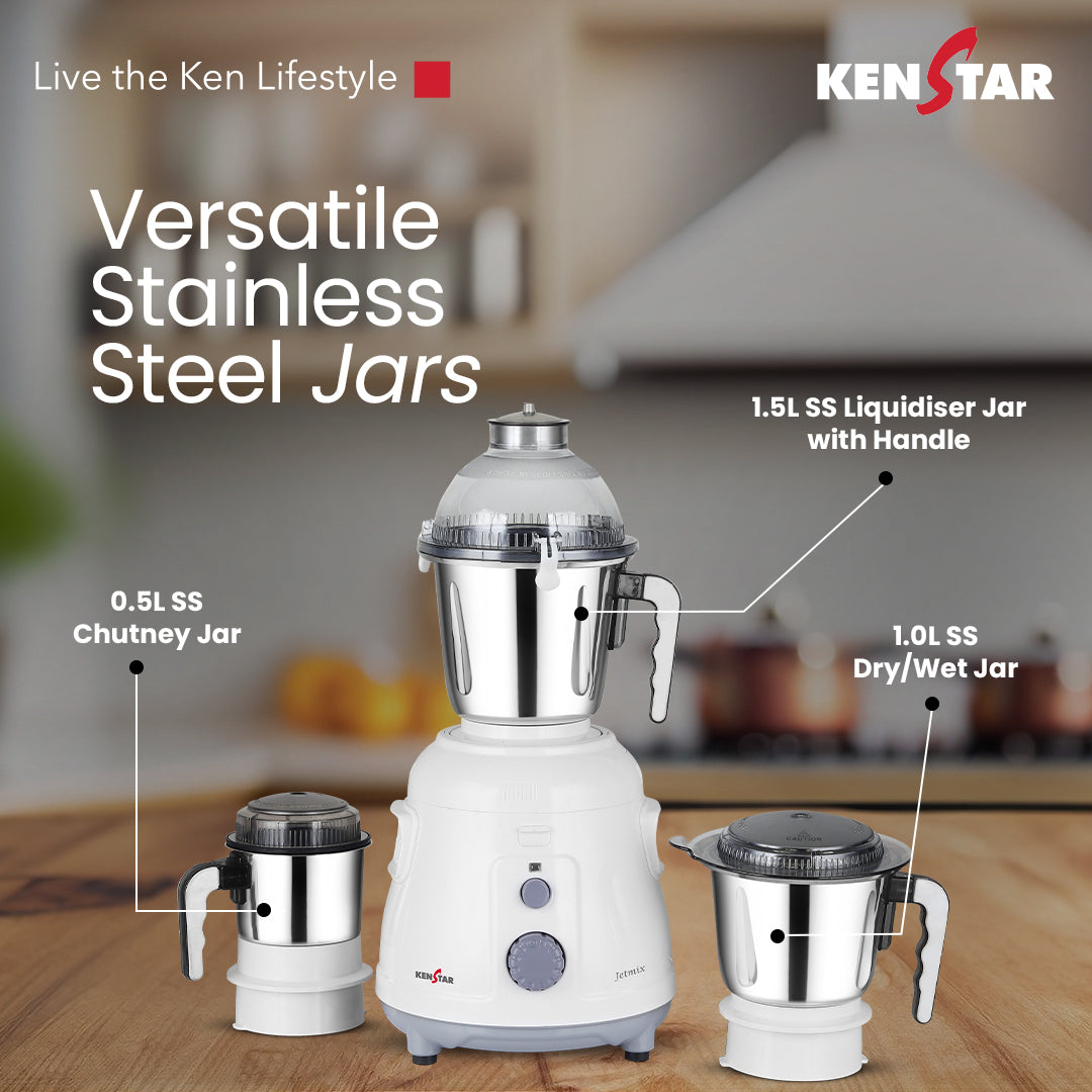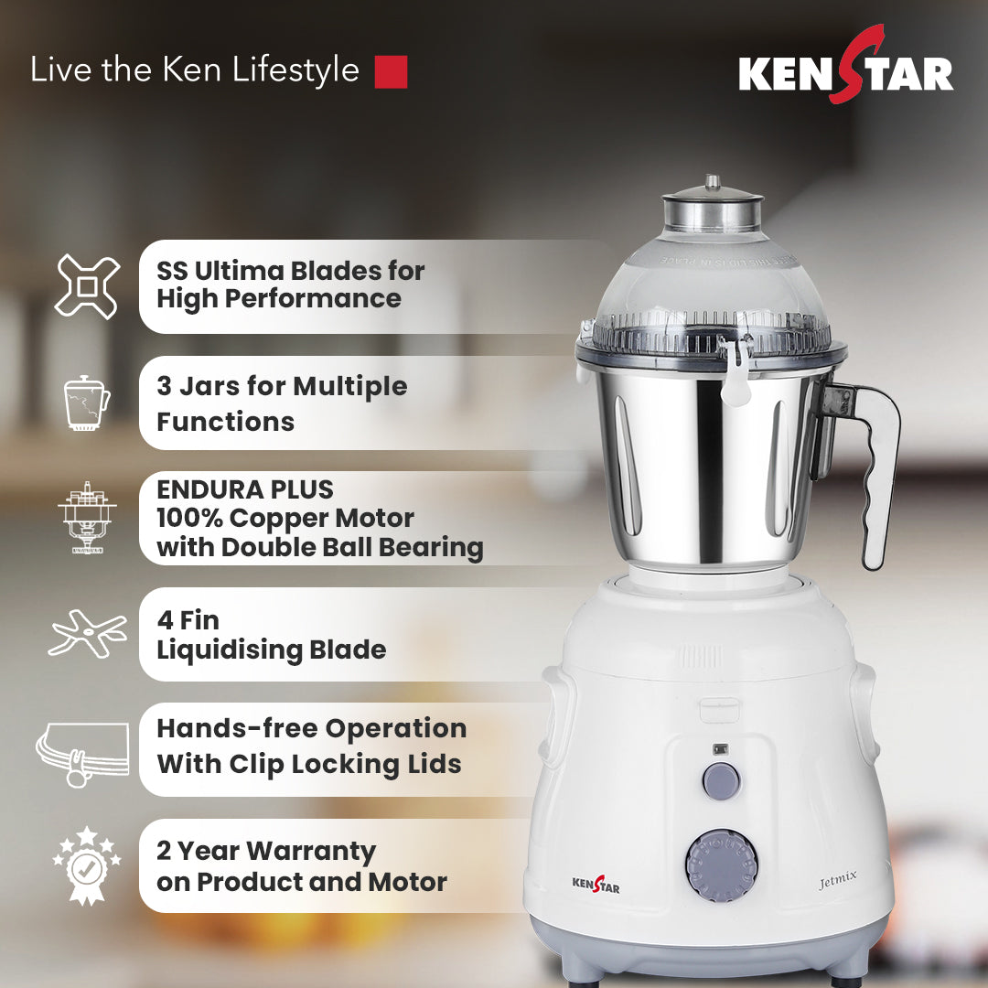 The Jetmix features a robust Endura Plus 100% copper 1000W motor that delivers powerful performance for all your grinding and blending needs. It comes with three stainless steel jars—a 1.5L liquid jar, 1L dry jar, and 0.5L chutney jar—each designed with clip-locking lids and handles for secure and convenient use. The appliance is equipped with high-performance stainless steel Ultima blades along with a 6-fin liquidizing blade, ensuring efficient and thorough processing. Flow breakers are incorporated to enhance blending efficiency further. It is backed by a strong warranty offering 5 years on the motor and 2 years on the overall product, providing reliable and long-lasting operation.