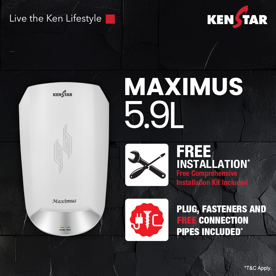 Maximus Instant geyser is designed for quick, efficient, and safe performance. It comes with a 5.9L water tank equipped with glass wool insulation, which helps retain heat for 10% longer, ensuring energy-efficient operation. Powered by SwirlHeat Technology, it delivers 20% more hot water output for better usability. Safety is a top priority with its 7-Level Safety Shield, offering comprehensive protection against overheating, pressure build-up, and electrical issues. With a 6.5 bar pressure rating, it's well-suited for high-rise buildings. The unit features IPX1 protection, guarding internal components from vertical water drips to enhance longevity. Its durable, non-corrosive plastic body resists wear and tear, while the nickel-coated copper heating element ensures long-lasting performance and corrosion resistance, even in hard water conditions.