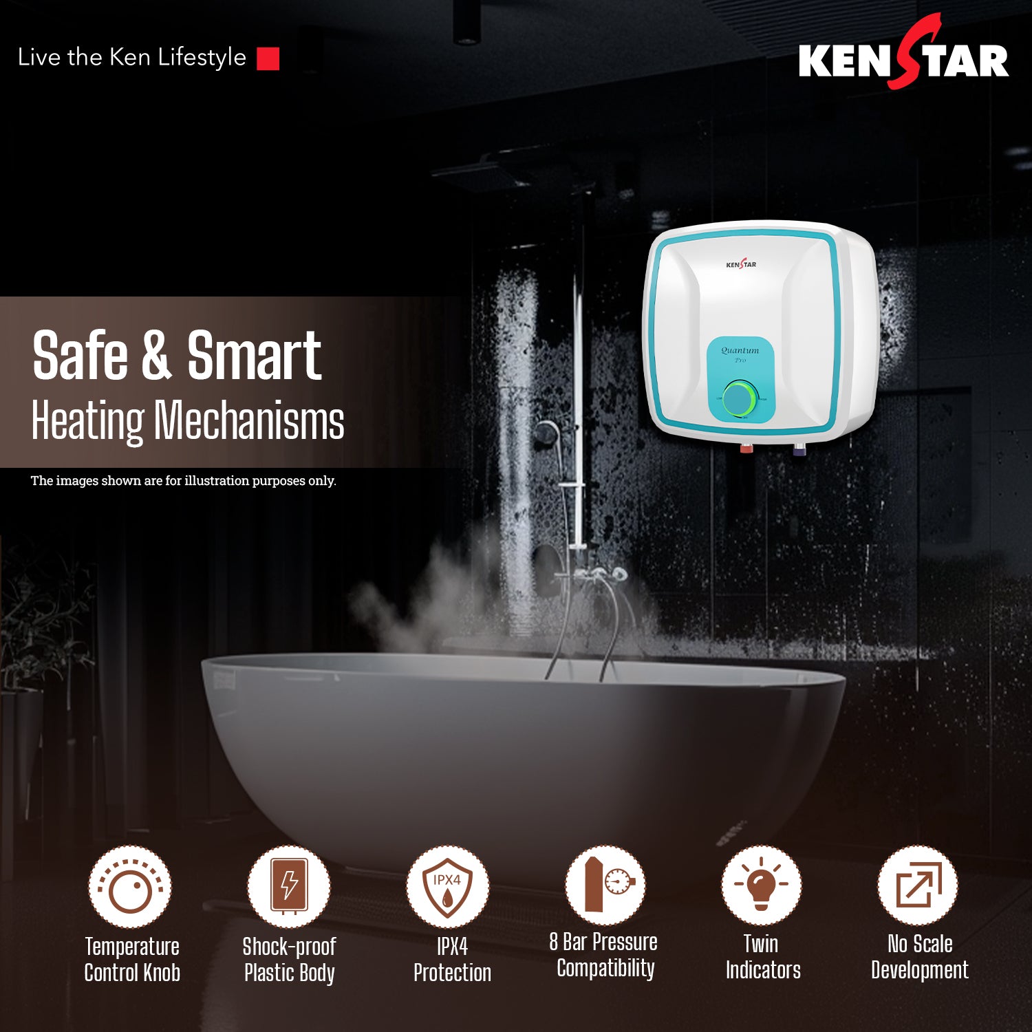 Enjoy a seamless hot water experience with the Kenstar water heater, designed for both comfort and safety. Its large 10L tank ensures a steady supply of hot water for relaxing baths, while the 8 bar pressure compatibility makes it ideal for high-rise buildings. With a temperature control knob, you can set the water just the way you like it, and the shock-proof body adds an extra layer of safety. The IPX4 protection keeps the heater safe from water splashes, enhancing durability and extending its life. Plus, the twin indicators provide clear status updates for power and heating, making operation effortless and convenient.